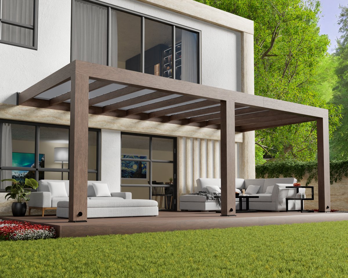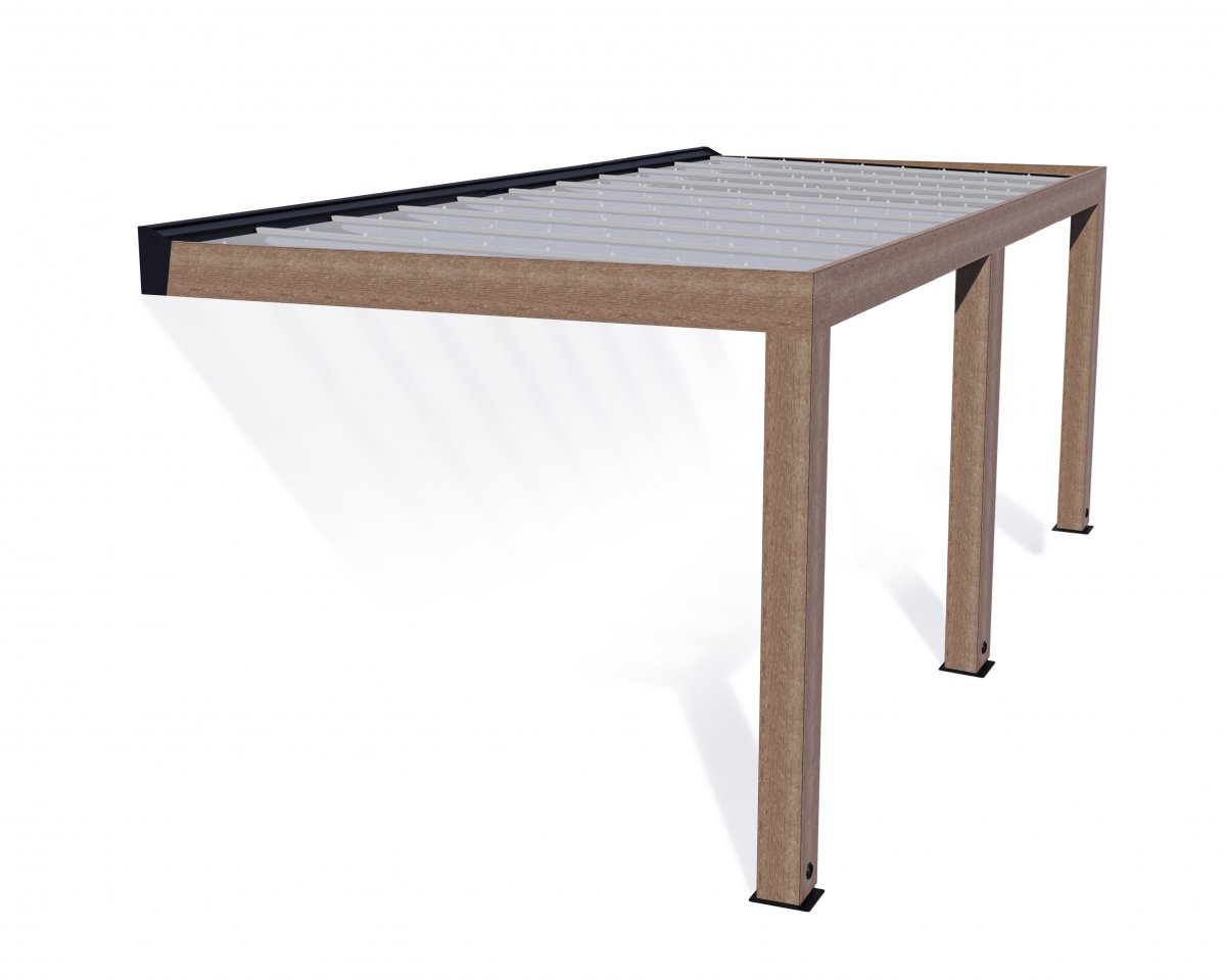 Den massiva strukturen med en strömlinjeformad, minimalistisk design har stora stolpar med integrerade rännor och grå Solar Control-läckagefria takpaneler som gör att du kan njuta av ditt utomhusutrymme året runt, hålla dig sval på sommaren och torr och skyddad på vintern.
