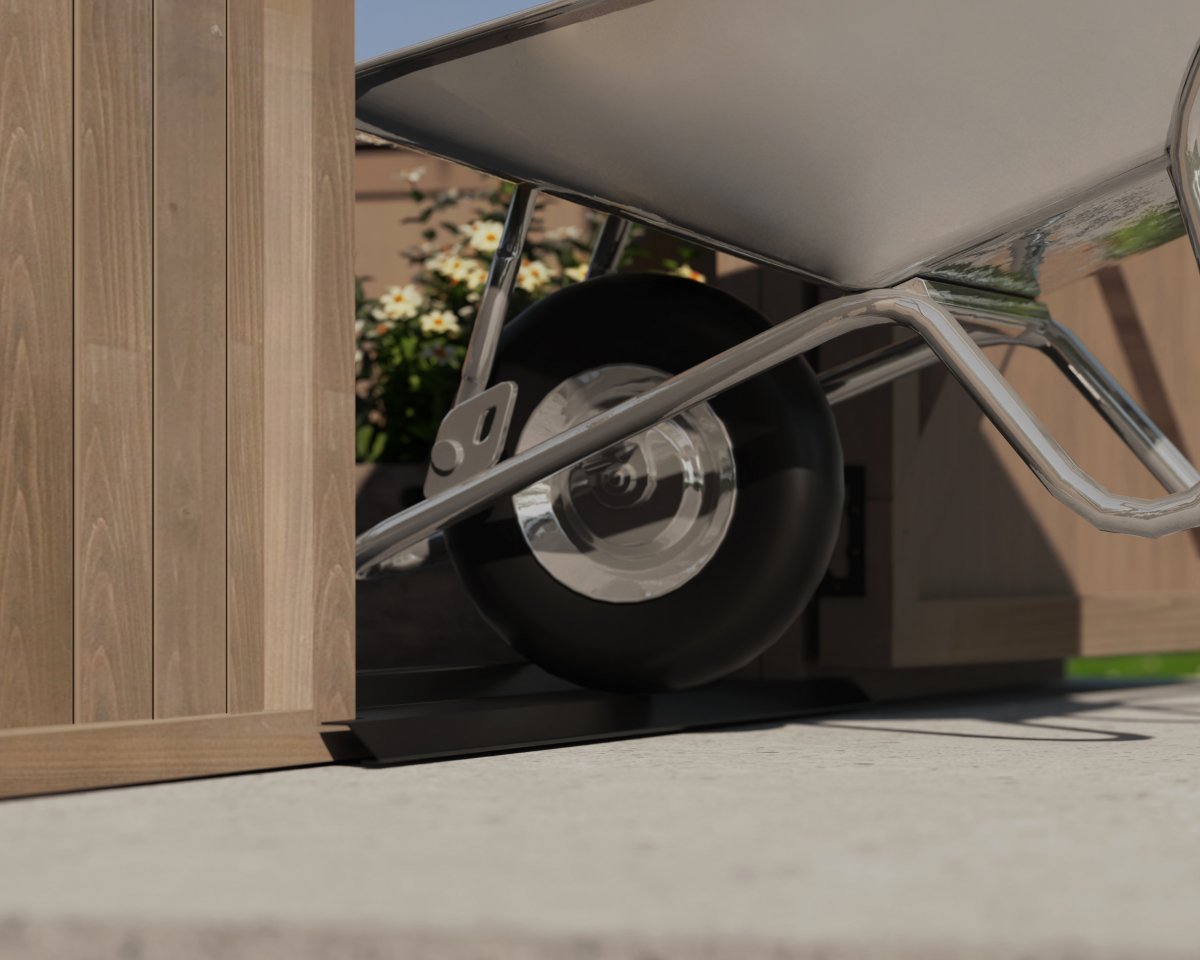 En bred, låsbar ytterdörr med en ramp med låg tröskel gör det enkelt att flytta växter, verktyg eller sig själv in och ut.