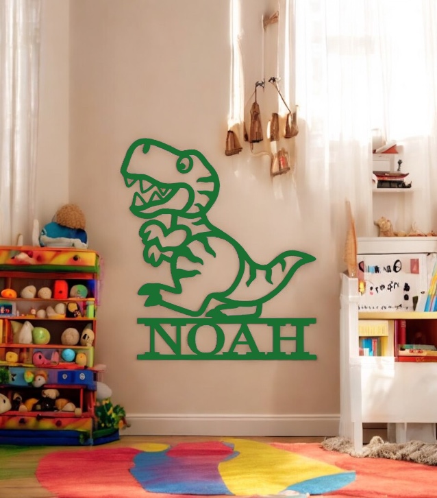 Produktbeskrivning:Fint väggmotiv i form av en dinosaurie med valfritt namn. Perfekt till barnrummet eller att ge bort i present.
