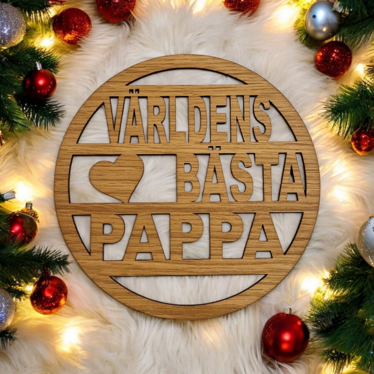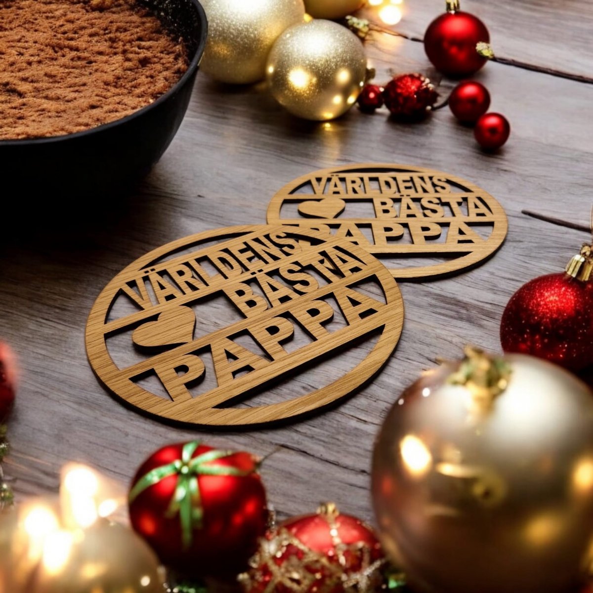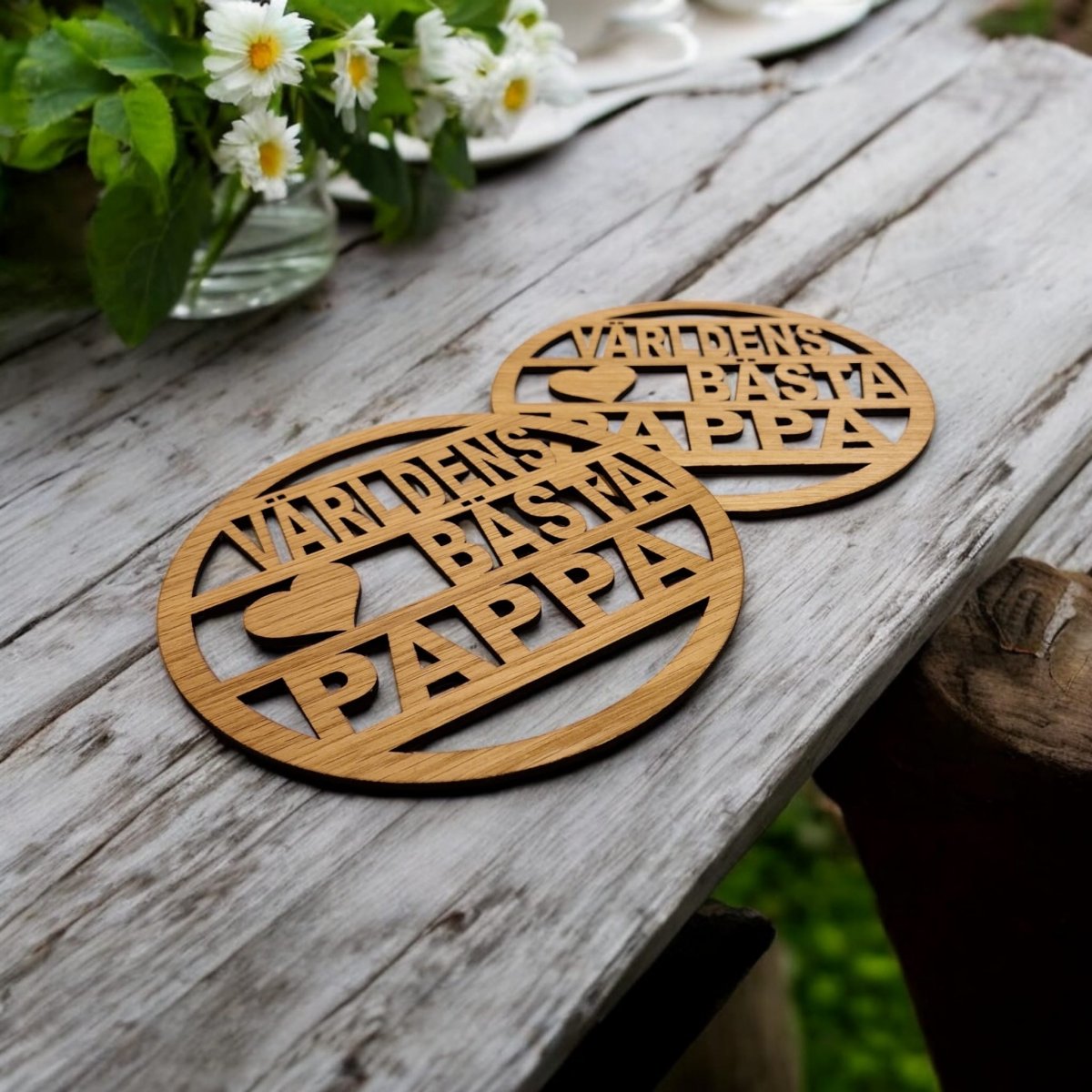 Produktbeskrivning: Överraska pappa med grytunderlägg med texten världens bästa pappa, tillverkade i snygg oljad ek-fanér.